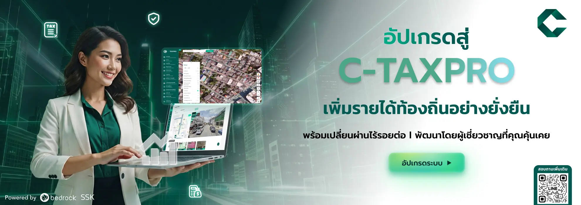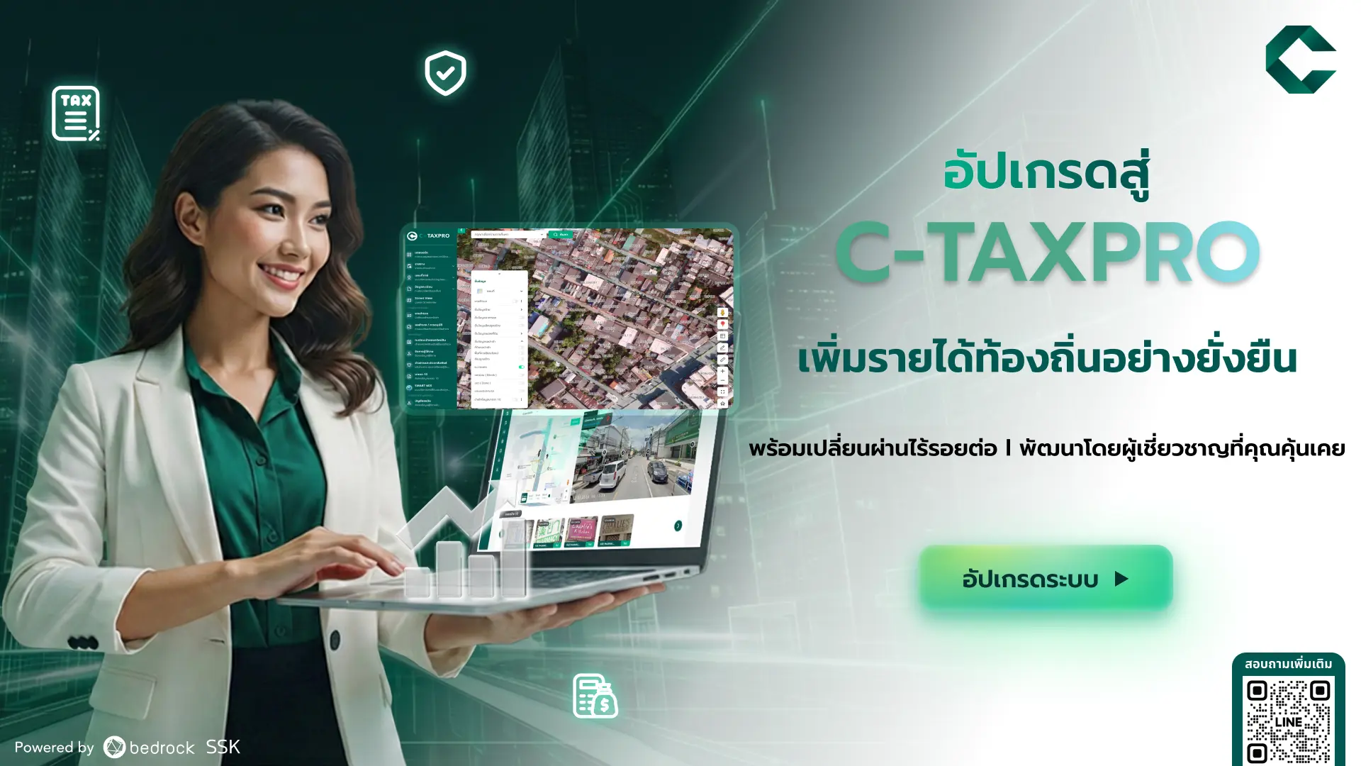 จากการผนึกกำลังระหว่าง Bedrock Analytics ผู้นำด้านงานสำรวจและโซลูชันด้านข้อมูลเชิงพื้นที่และ SSK ทีมผู้พัฒนาระบบเดิมที่เชี่ยวชาญระบบภาษีที่สุดในประเทศ สำหรับการบริหารระบบภาษีของเมืองอย่างยั่งยืนทั้งสององค์กรร่วมกันพัฒนา C-TAXPRO แพลตฟอร์มภาษี ที่ออกแบบมาเพื่อทดแทนระบบเดิม ด้วยเทคโนโลยีที่ดีกว่า เพื่อประสิทธิภาพสูงสุดของท้องถิ่น ไม่ว่าจะเป็นแผนที่ภาษี Cloud Security มาตรฐาน ISO 27001 ที่สอดคล้องกับกฎหมายภาครัฐ ผสาน AI และระบบชำระเงิน จนเป็น 'Super Solution' สำหรับการบริหารเมืองอย่างยั่งยืน